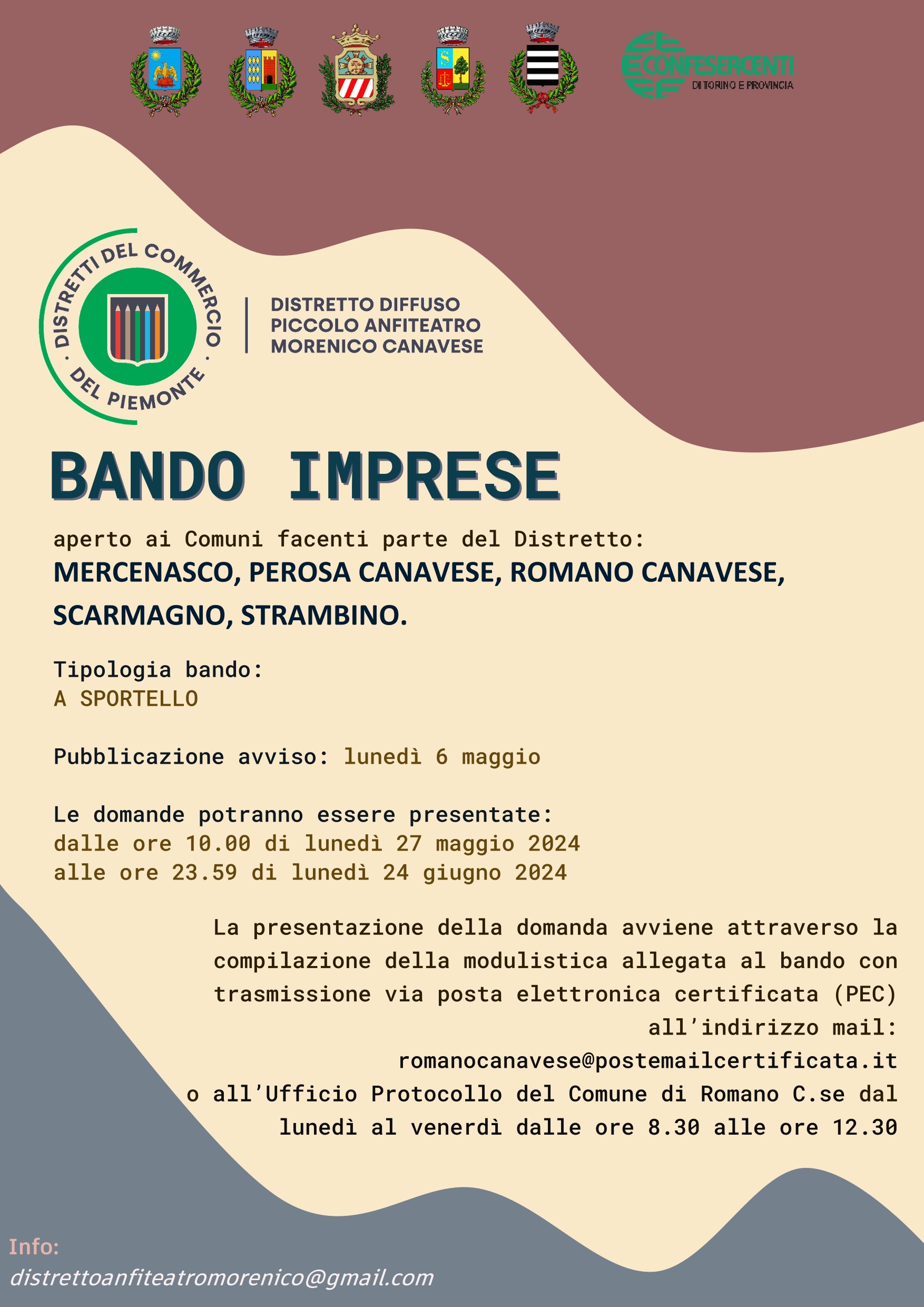 La Regione Piemonte ha avviato un bando per la concessione regionale relativa ai progetti strategici dei Distretti del Commercio del Piemonte, inseriti nell'elenco regionale, di cui almeno il 30 % è da destinare per tramite il Comune di Romano Canavese, in qualità di capofila, interventi diretti a favore delle "imprese esercenti attività di vendita diretta al dettaglio di beni o servizi e quelle esercenti l'attività di somministrazione al pubblico di alimenti e bevande aventi sede operativa nell'ambito territoriale del Distretto, in forma singola o aggregata".